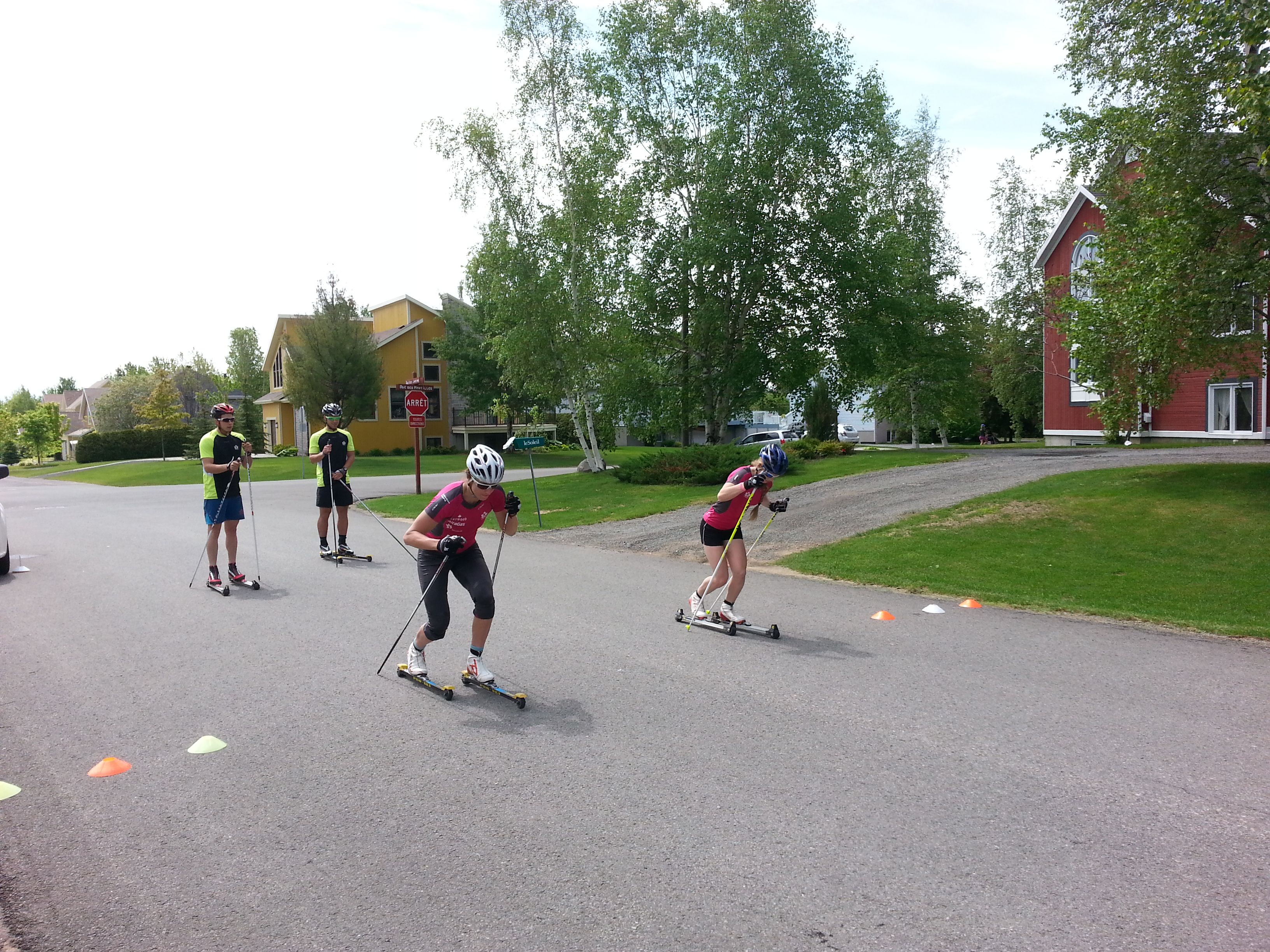 Alex Harvey (right, with Simon Lapointe) has a personalized training program, so after stopping by to chat with his teammates, he went out on his own. But he showed up to see the group. He is one of the most generous star athletes in Canada. Strong. Intelligent. Genuine./Alex Harvey (à dr. et Simon Lapointe) suit un programme d’entraînement personnalisé, mais il est venu rencontrer ses coéquipiers du Centre. Champion du monde et généreux en plus.