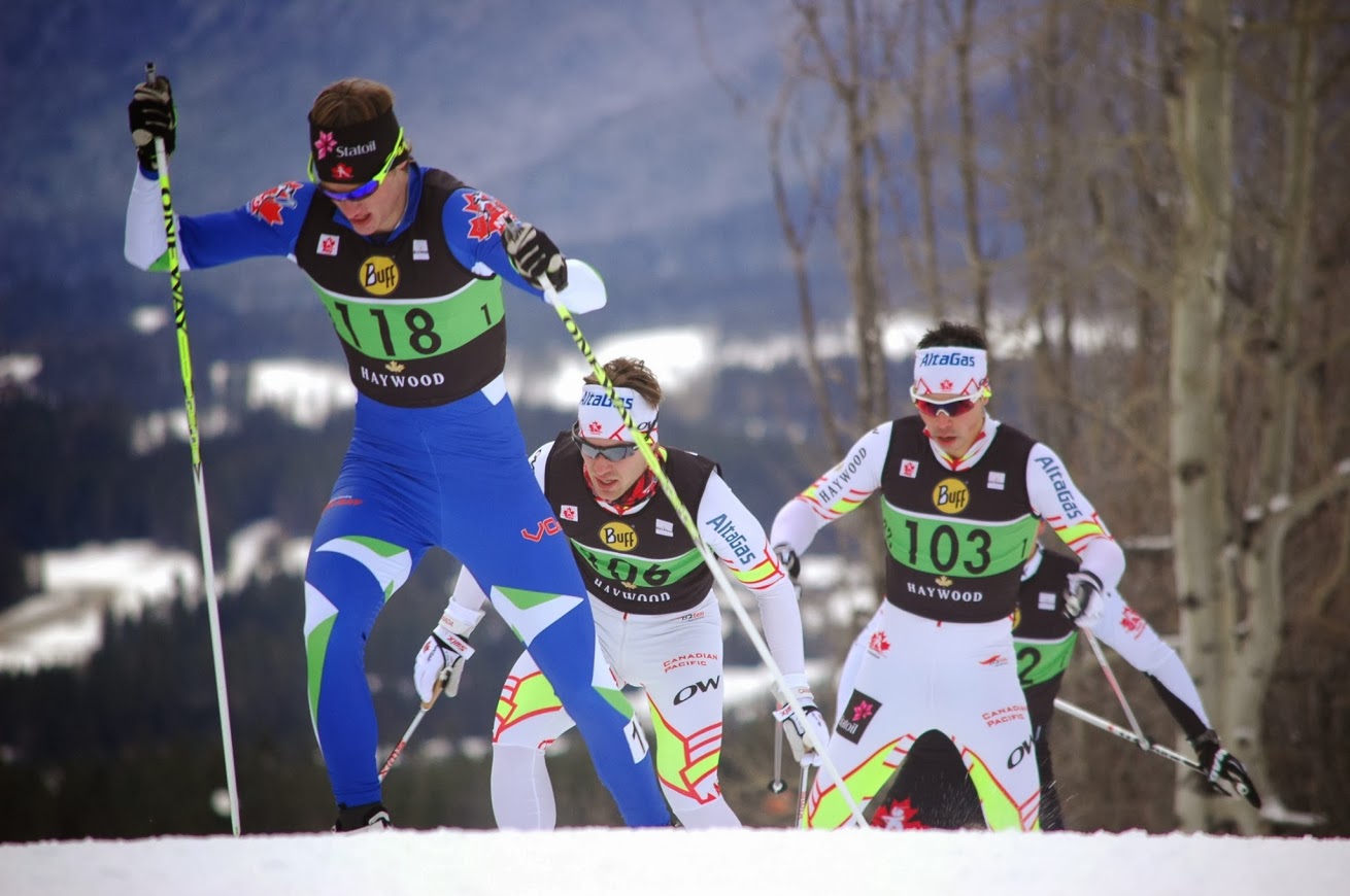 Graham Nishikawa (#2), Brian McKeever (#5) and Kevin Sandau (#4) gave it all, but they also came up short. Graeme Killick (#3, long hair) took the men’s skiathlon. (Photo: Angus Cockney)